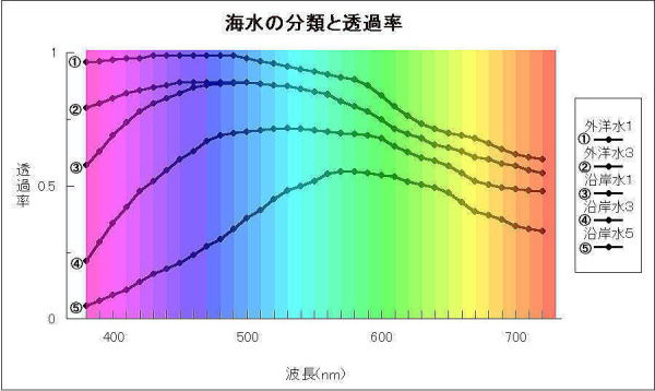 上表は海域と各波長の光の透過率を示すものです。各漁場の海色にあった波長の光を選択されることをお薦めします。