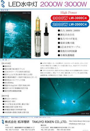 ・水中灯の専業メーカーである弊社が,これまでのハロゲン水中灯,メタルハライド ・当社のLED水中集魚灯は,既存の灯具および既設の水中灯巻揚機を使用した従来の ◎弊社UL灯具,水中灯巻揚機,水中灯ケーブルと完全互換です。 ・まき網(旋網,巻網)漁業,中型イカ釣り漁業を中心に,既に多くの船に御購入頂き, 【基本性能】 【操作性】 |