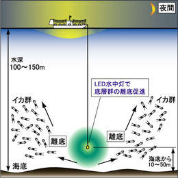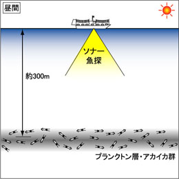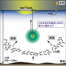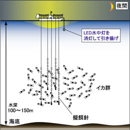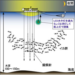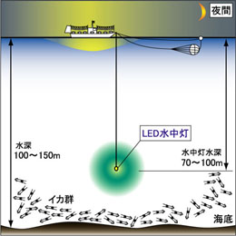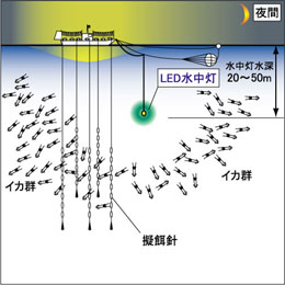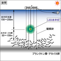 【操業例1】 水中灯を使用した深海イカ(アカイカ)の昼間操業過程