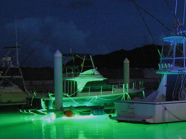 水中照明は光色を選べます。季節や時間帯によって魚も集まってきます