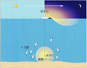 徐々に減光しながらイカ群を上灯まで誘導引き上げる.