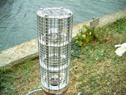 - 水中灯を河川内に設置するため,上流から流れてくる流木等から電球を保護するために, 水中灯ガードの外周を金属製のメッシュで覆う加工を施しました。